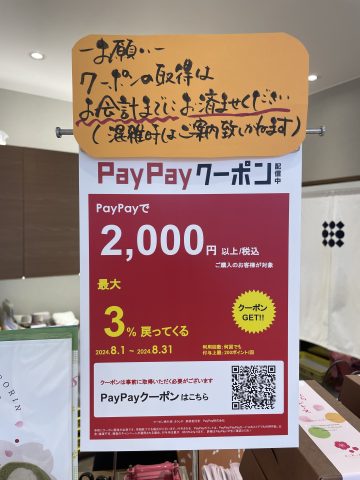 現在店頭で、お得なPay Pay クーポン配布中。お支払い前に、レジ近くに掲示してある2次元コードを読み取ってGETしてくださいね!
