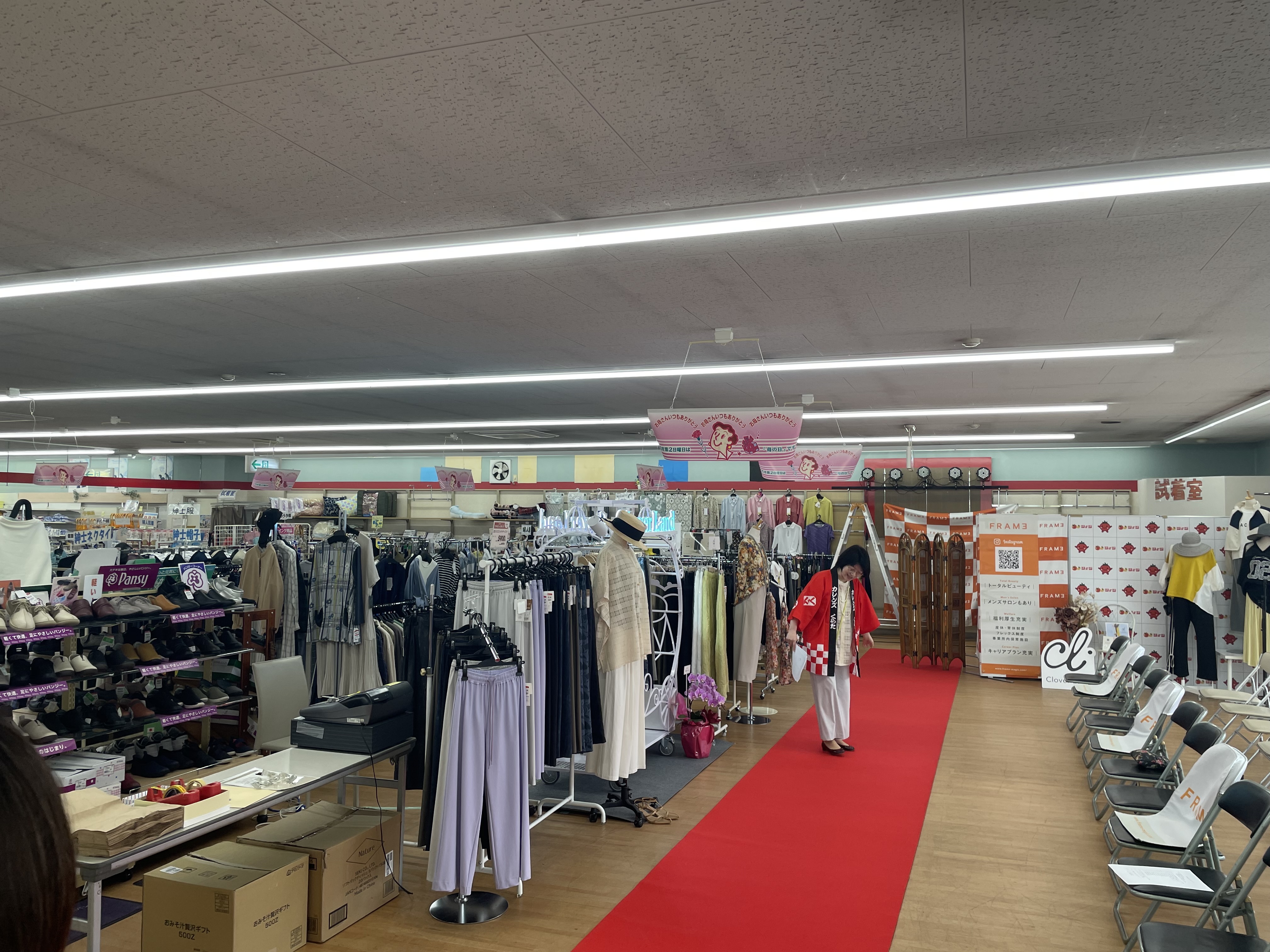 今回の注目は、店舗の入り口を入ってすぐに敷かれたレッドカーペット。カレンズKURATAで取り扱う洋服を志和にゆかりのあるお客様が纏いランウェイを歩くファッションショー(カレコレ)。今回は3回目。地域の福祉事業者と連携しての開催で、障がい者支援施設「西志和農園」とコラボレーションです。施設利用者や職員をはじめ、志和の福祉事業に携わる方々がモデルとなって春夏の洋服を披露します。出番前で少し緊張しているモデルさん達に、蔵田店長がランウェイの歩き方をレクチャーする場面もありました。(ファッションショーの様子はインスタグラムでチェック)