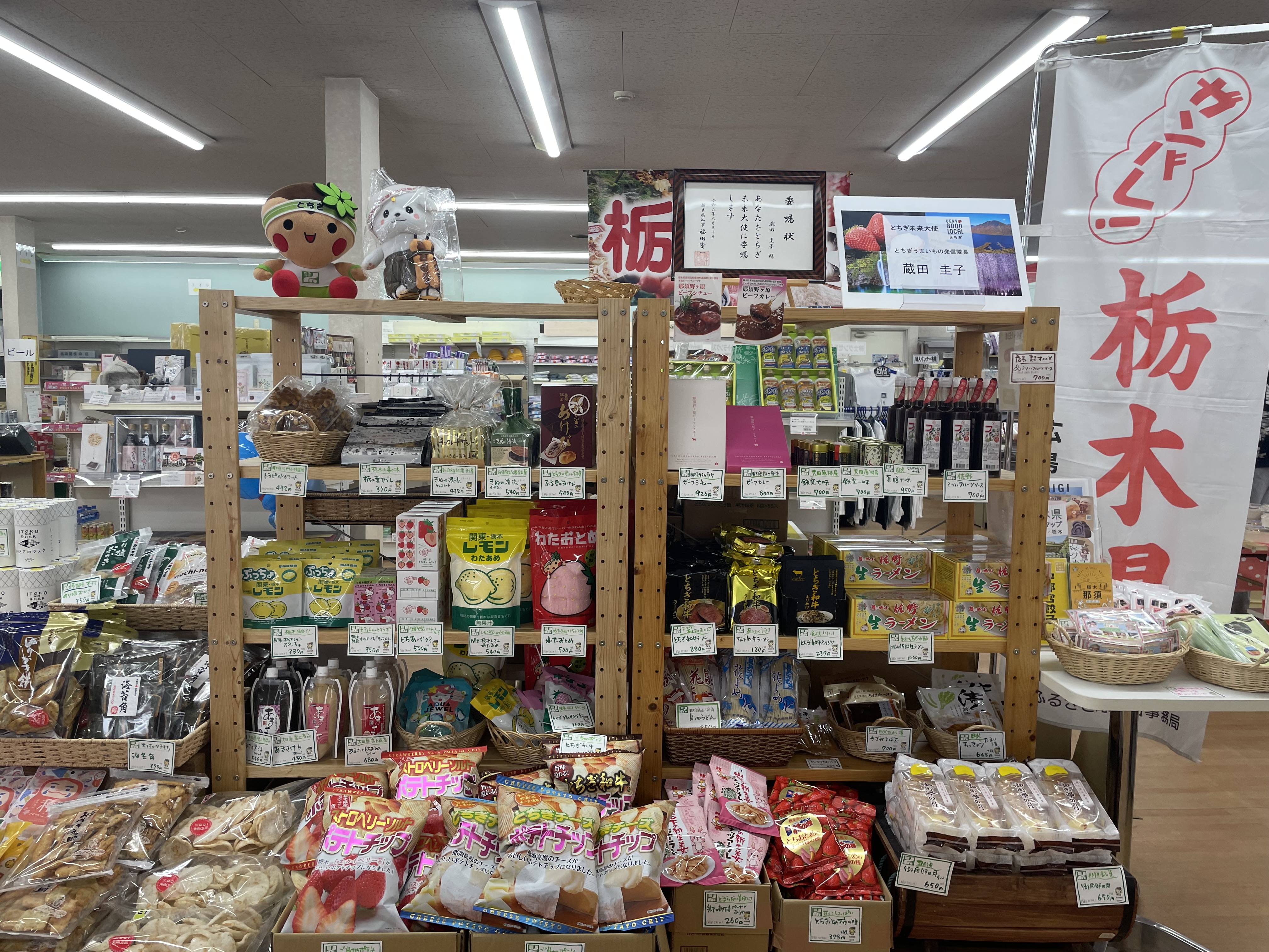 栃木県出身の蔵田圭子店長は、栃木県の魅力を発信する活動が注目され、栃木県知事より任命された「とちぎ未来大使」です。「栃木物産展in志和」には、蔵田店長の厳選した商品が並び、名産品だけでなく、栃木の方々に親しまれている商品もたくさんありました。
