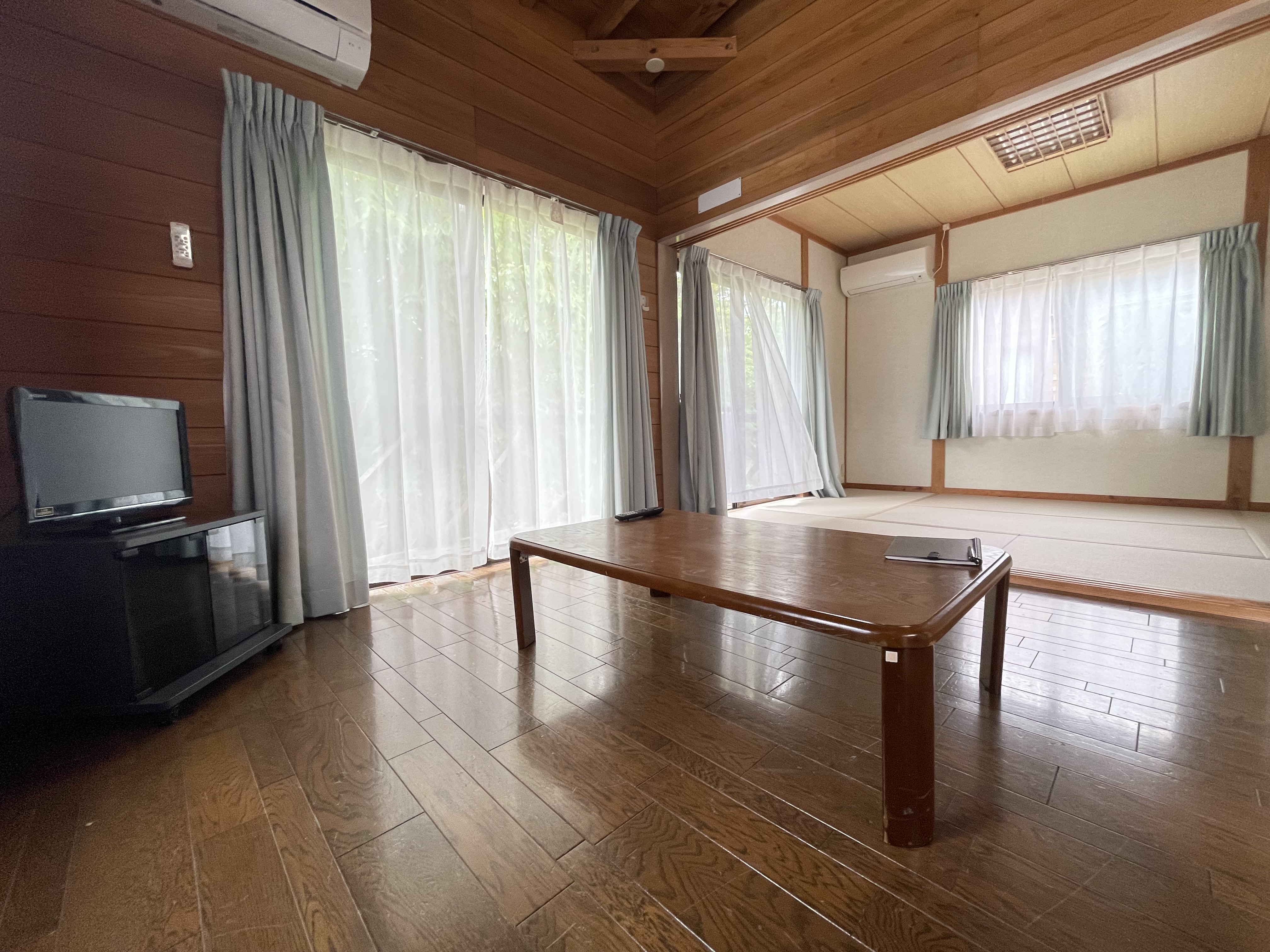 天井が高く開放感のある部屋。和室と洋室の2部屋、テレビ、エアコン完備です!広島空港に近い立地を活かし、連泊してホテル感覚で利用される観光やビジネス利用のお客様も多いそうです。