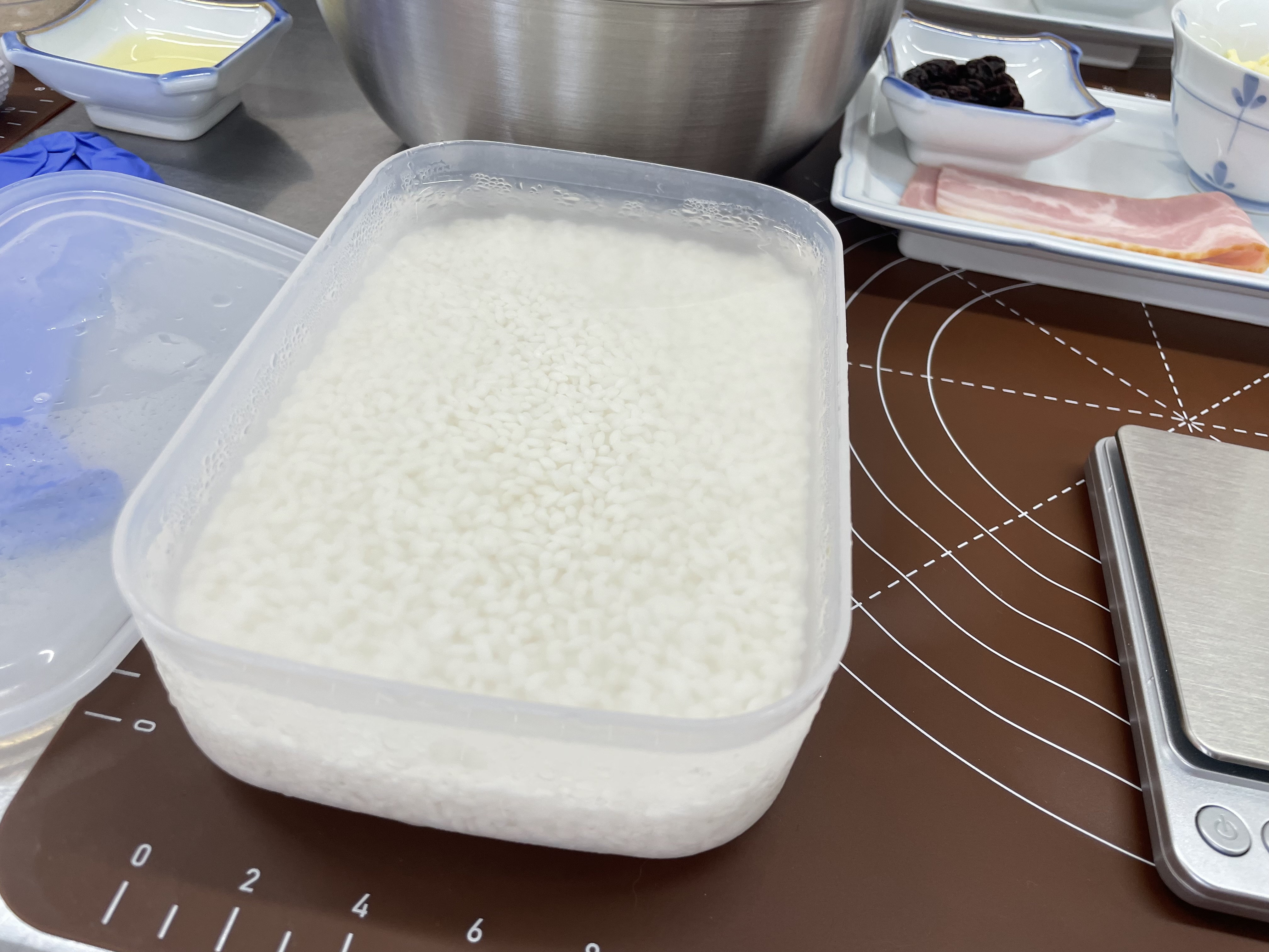 この日のレッスンは、「生米ハードパン」。なんと、生のお米からパンを作ると聞いて、思わず「えっ?」。調理台には、炊いていないお米が並んでいます。どうやら、お米を浸水させた状態からミキサーで粉砕し、生地を作るのだそうです。