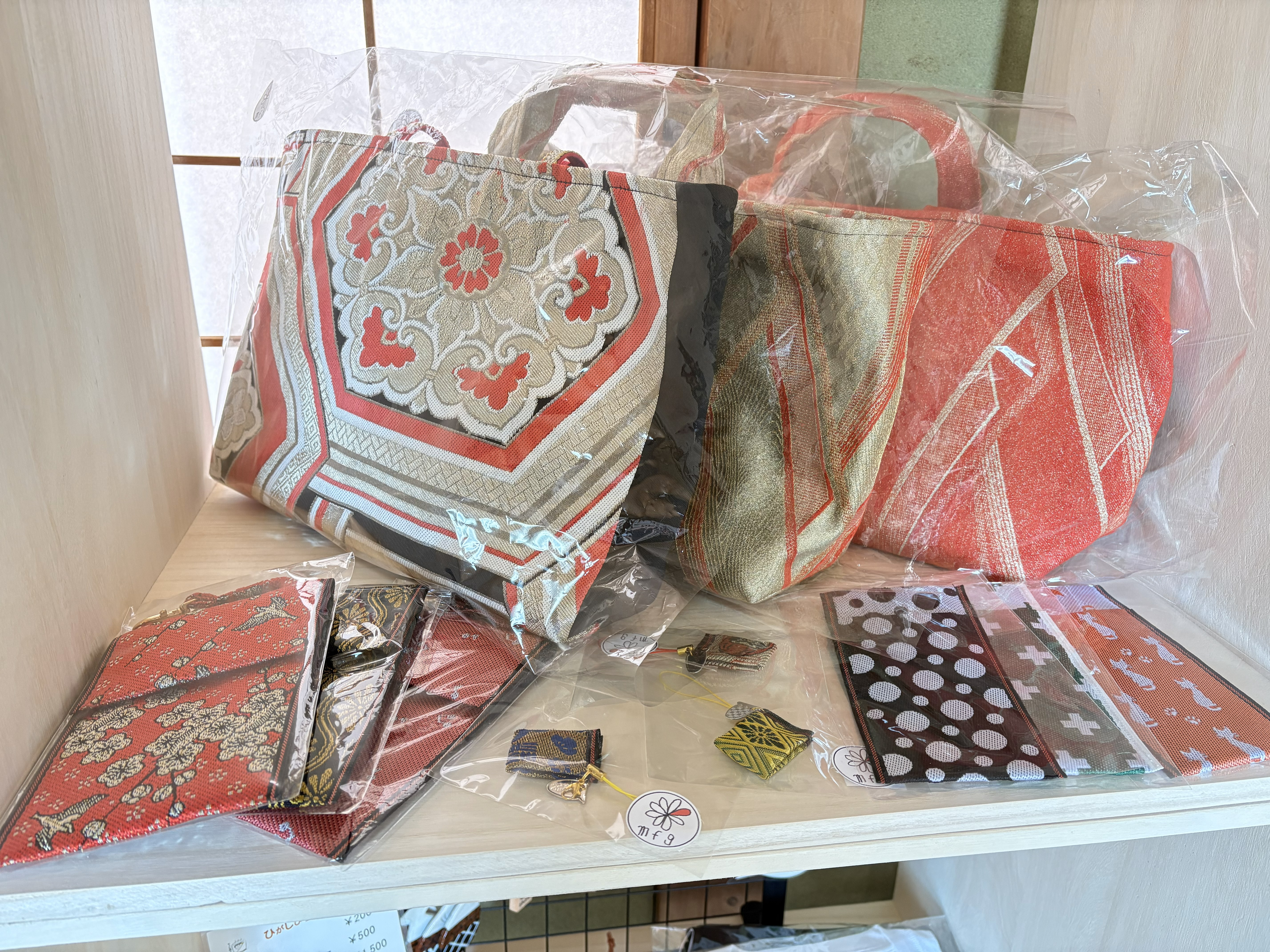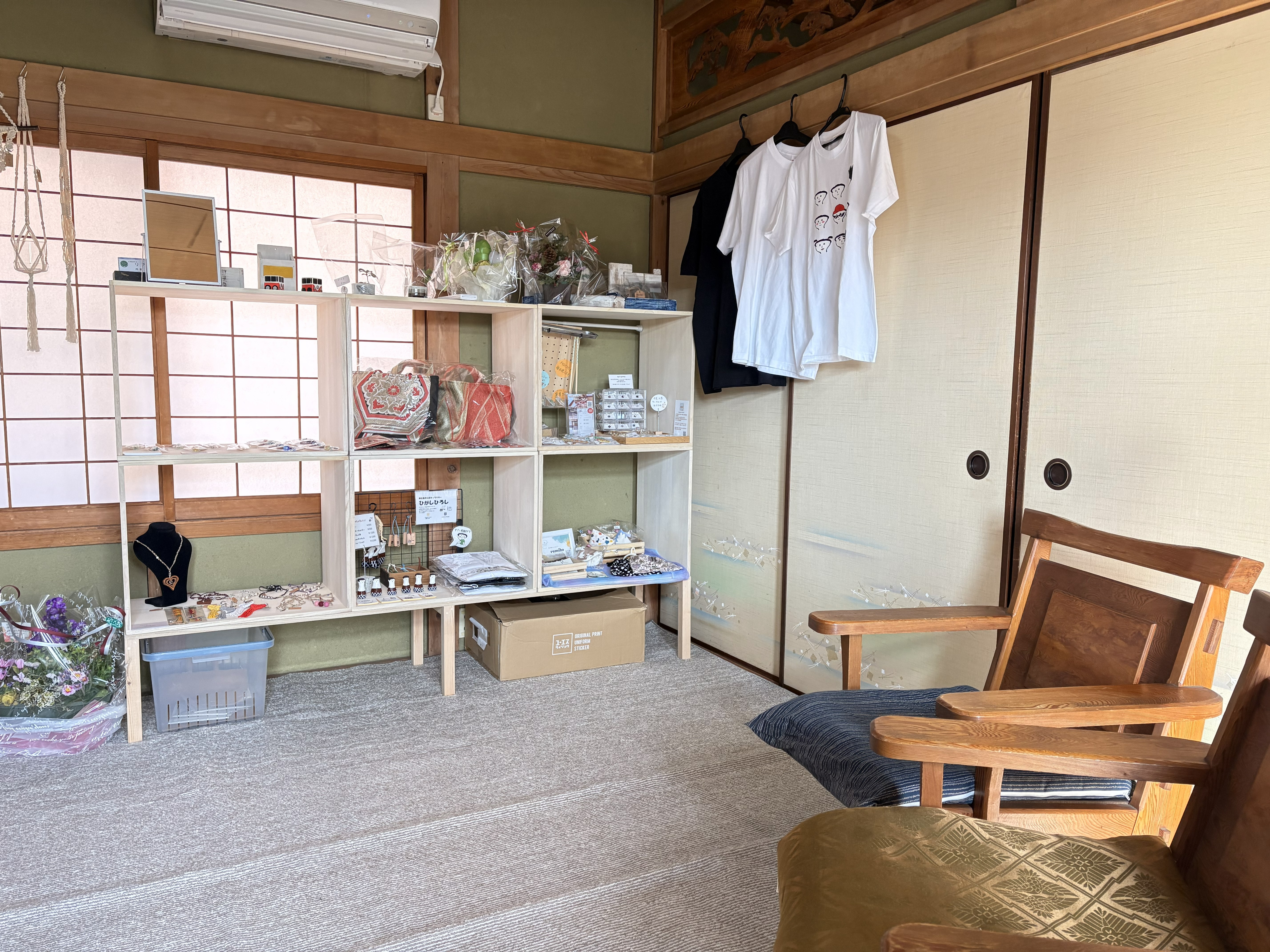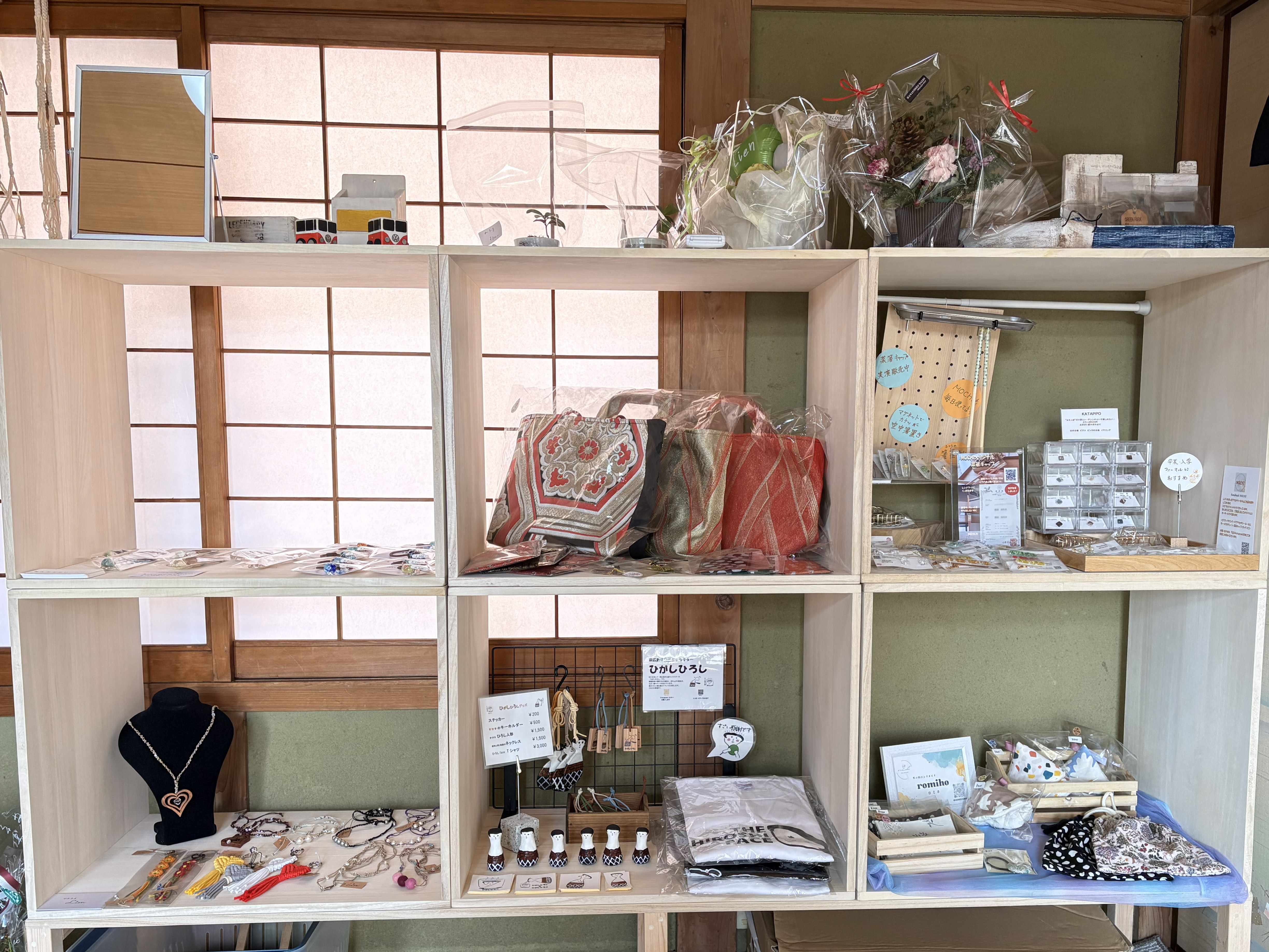 広い縁側がそのまま入口になっていて、奥の和室にはハンドメイド作家さんの作品が並んでいました。作家さんは、この棚の一角を借りて作品を販売しています。ワークショップの開催も可能で、訪れる人との交流が生まれる場所になっています。