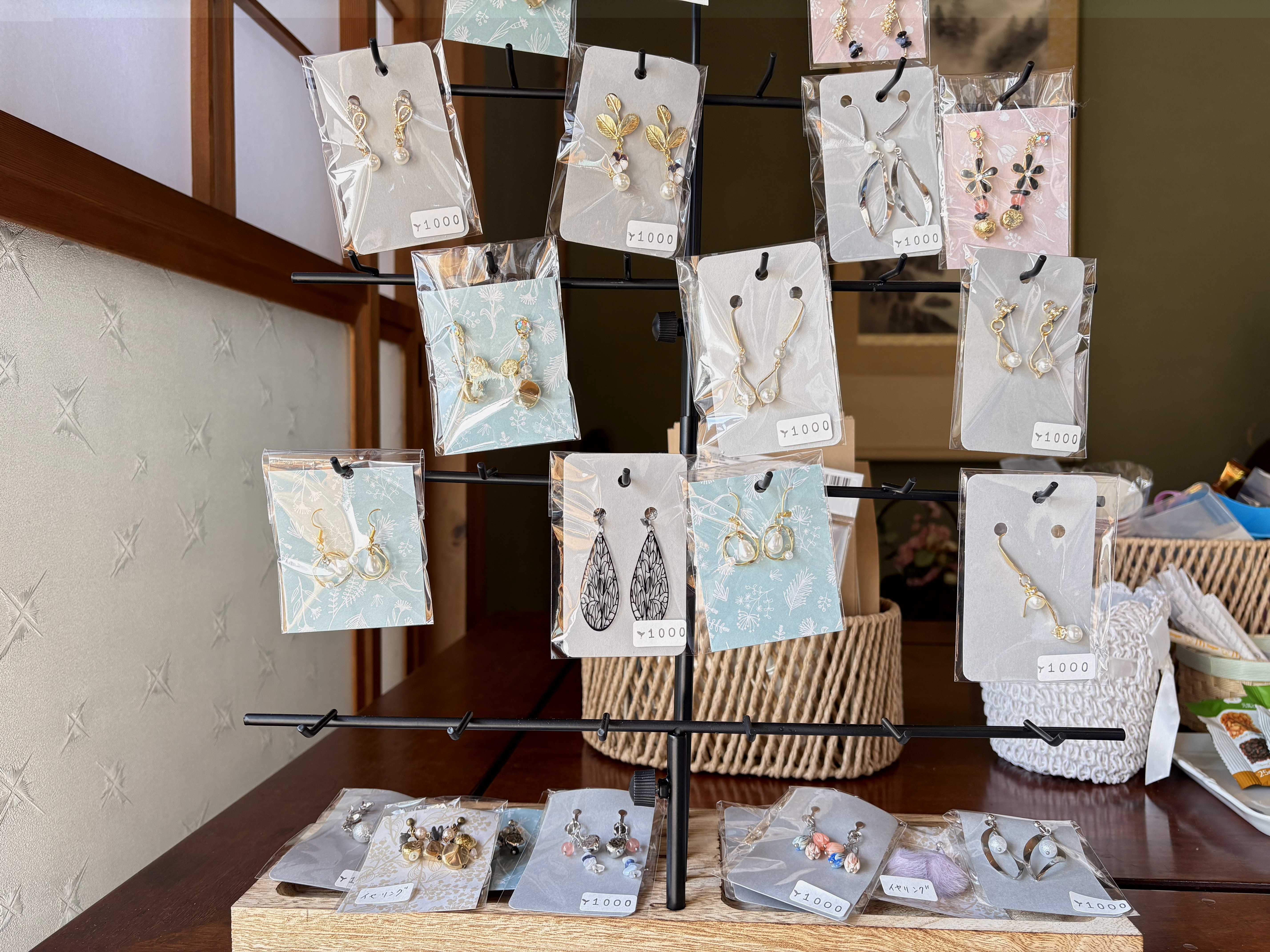 棚には、アクセサリー、バッグ、チャーム、雑貨など、さまざまなハンドメイド作品が並んでいます。どれも、オーナーの内藤さんが以前からご縁のある作家さんたちの手によるもの。ひとつひとつに個性があり、眺めているだけでも楽しくなる空間です。