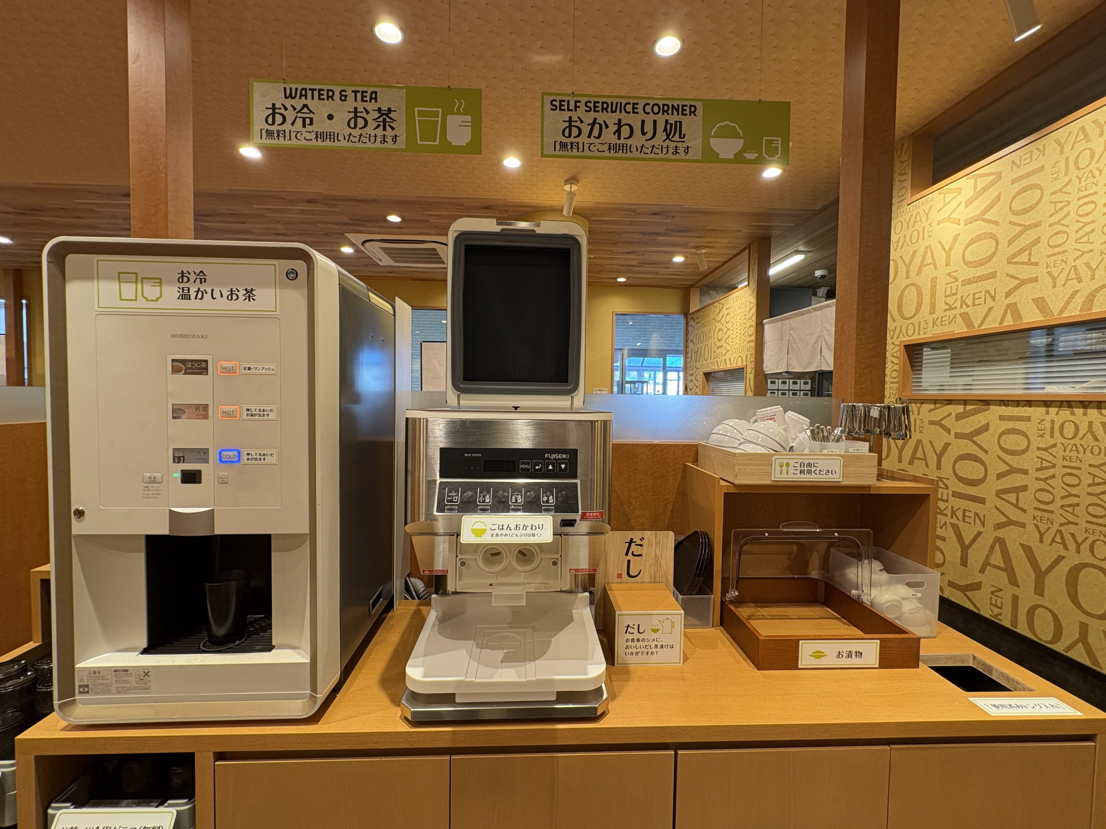 店内の一角には、「おかわり処」。セルフでお冷やお茶、ご飯のおかわりなどが無料で利用できます。