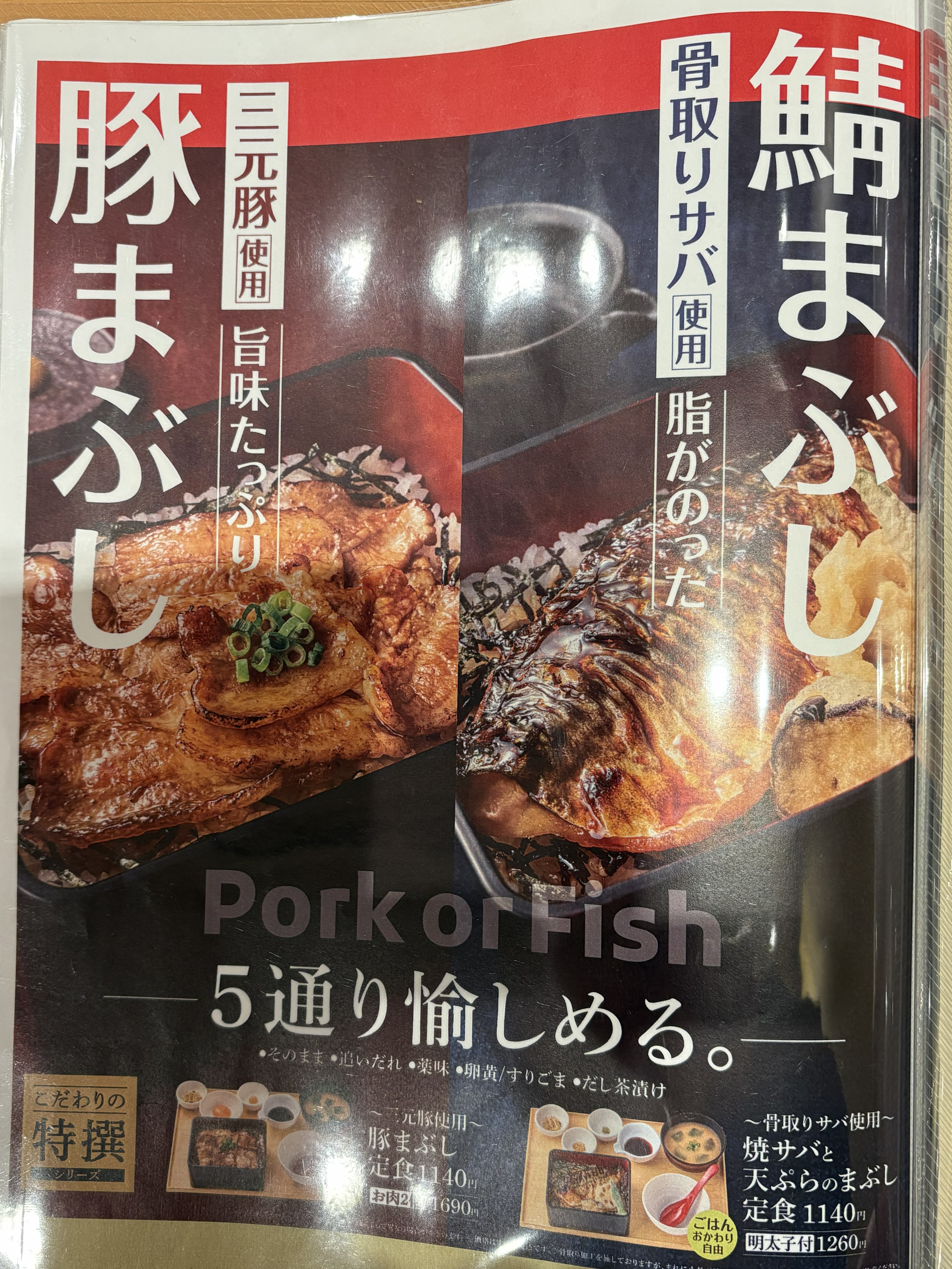 三元豚の旨味が詰まった「豚まぶし」と、脂ののった骨取りサバを使った「鯖まぶし」は、ひつまぶしスタイルで5通りの味わい方が楽しめます。