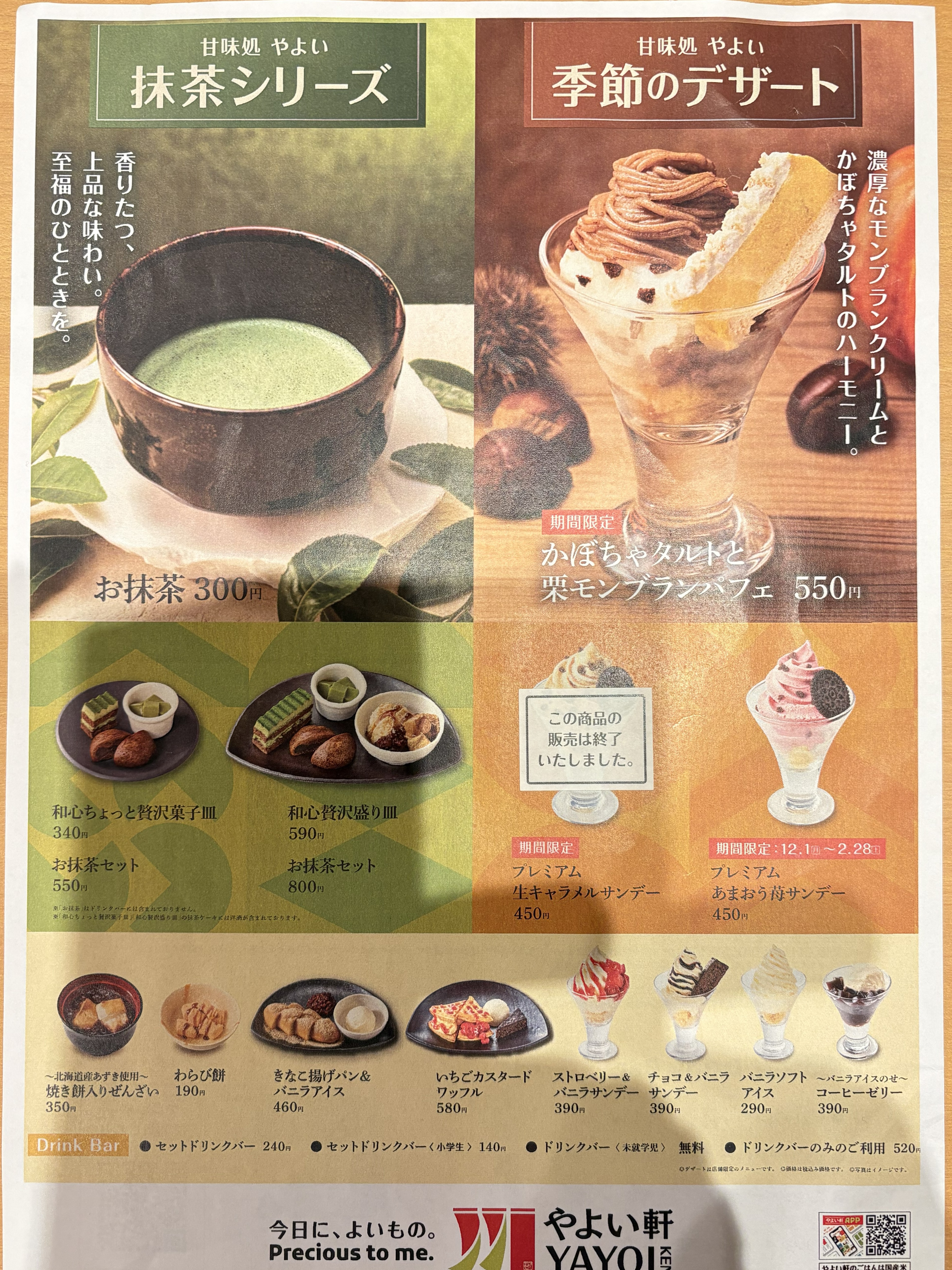 バニラソフト、ストロベリーソフト、チョコレートサンデーなどに加え、「甘味処やよい」の抹茶シリーズや季節限定のスイーツも登場しています。カフェタイムにもぴったり!