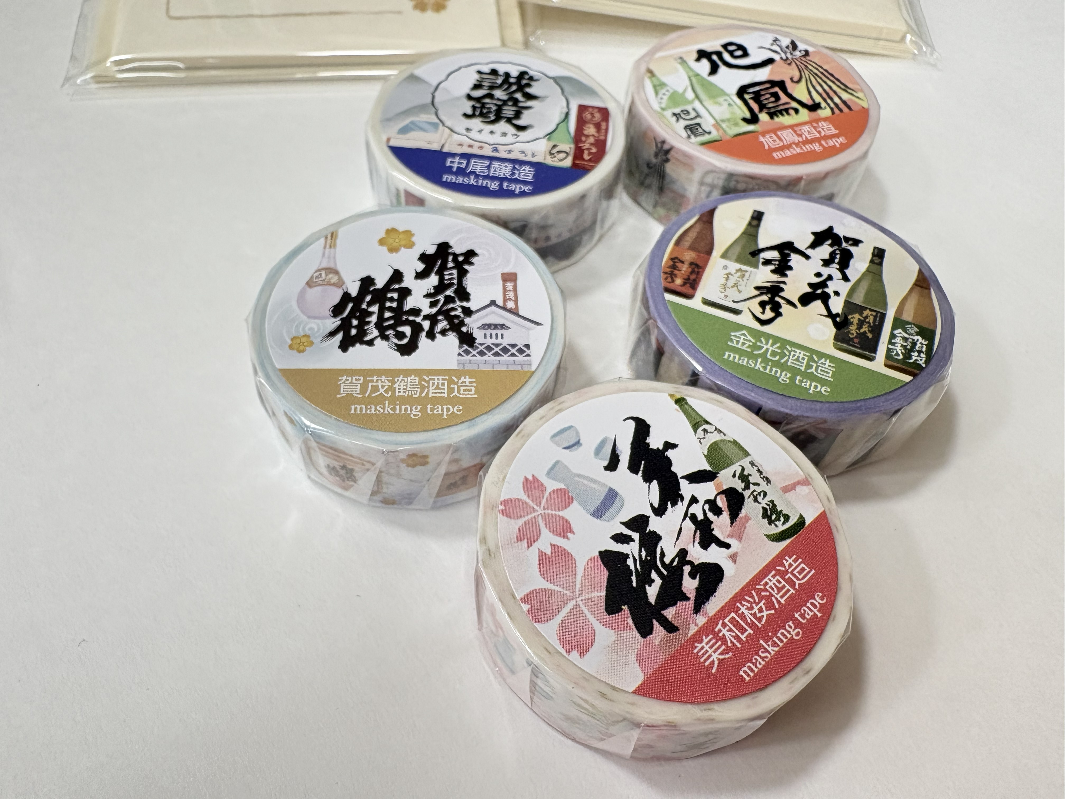 酒蔵のロゴや酒瓶、蔵の風景などが描かれていて、落ち着いた色合いとかわいらしい絵柄が特徴。使うだけでなく、コレクションしたくなるデザインです。