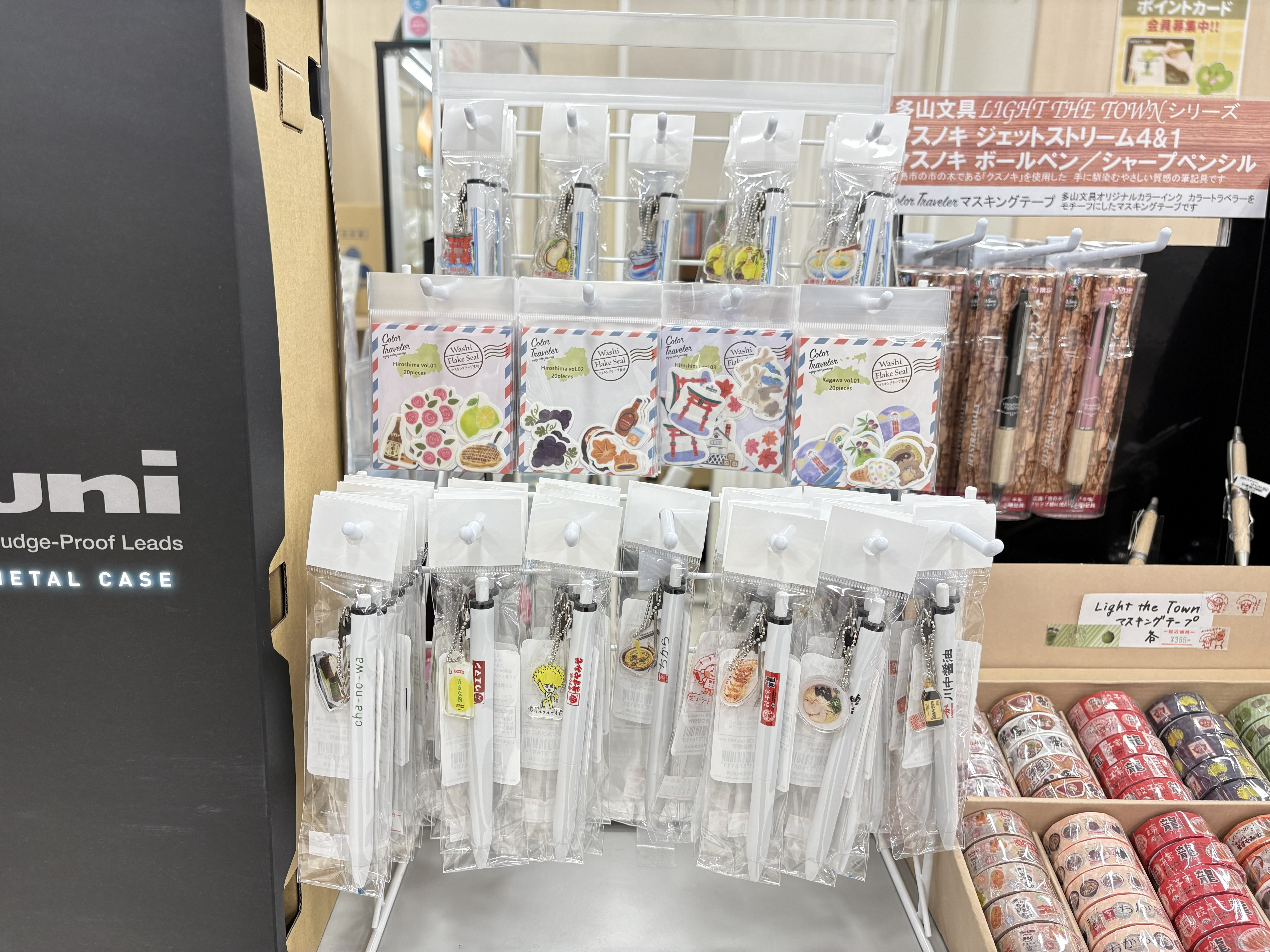 広島の木材(広島クスノキ)を使った木軸ボールペンやシャープペン、ご当地モチーフのマスキングテープ、そえぶみ箋など、地域企業とのコラボアイテムも豊富です。