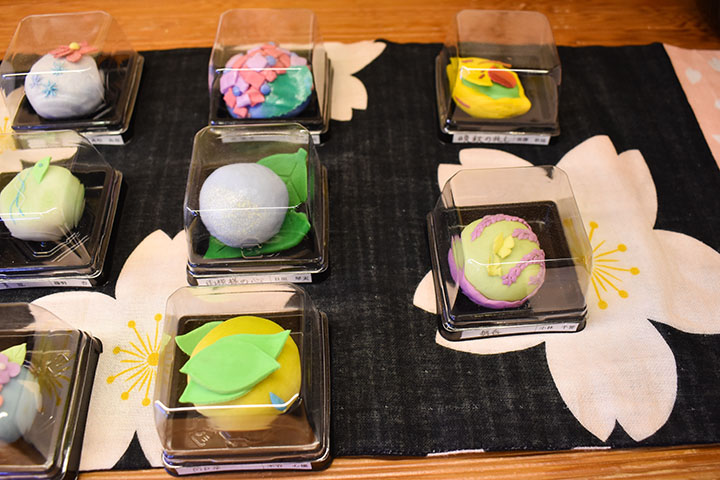 生徒ひとりひとりがテーマを決めて、色彩と形を工夫し、季節を感じる和菓子を制作。菓銘も国語辞典で意味を調べながら考えた。