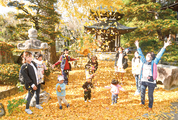 落ち葉で境内が黄色に染まると、近所の保育園児の遊び場になります。