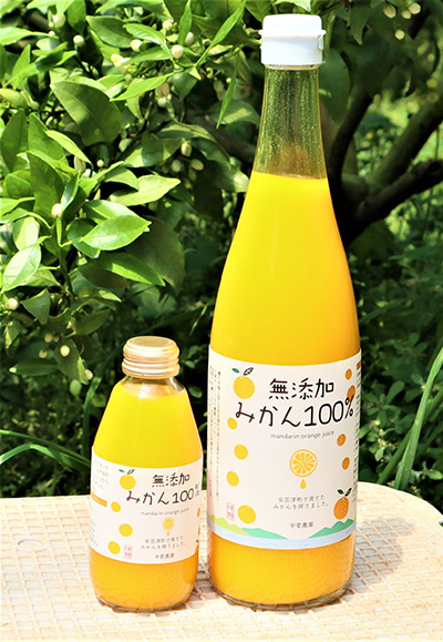 温州みかんを丸ごと絞った果汁100%の濃厚ジュース。食品添加物不使用。みかんを収穫して「みかん蔵」で貯蔵。追熟させて甘くおいしいみかんを厳選し、皮や袋の苦みが入らないようにやさしく搾りジュースにした。1本720ミリリットル450本限定、200ミリリットルは2500本限定。