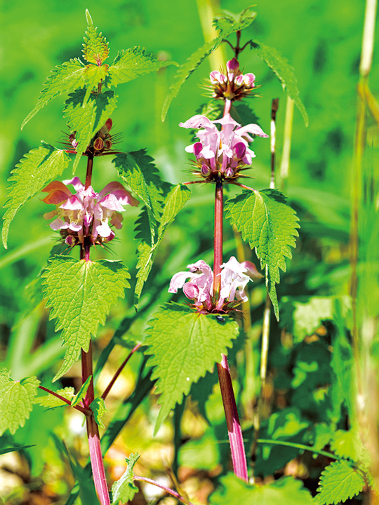 オドリコソウは、四角い茎の周りに丸く並んで淡紅色の花を付け、下から順に咲き上がっていきます。