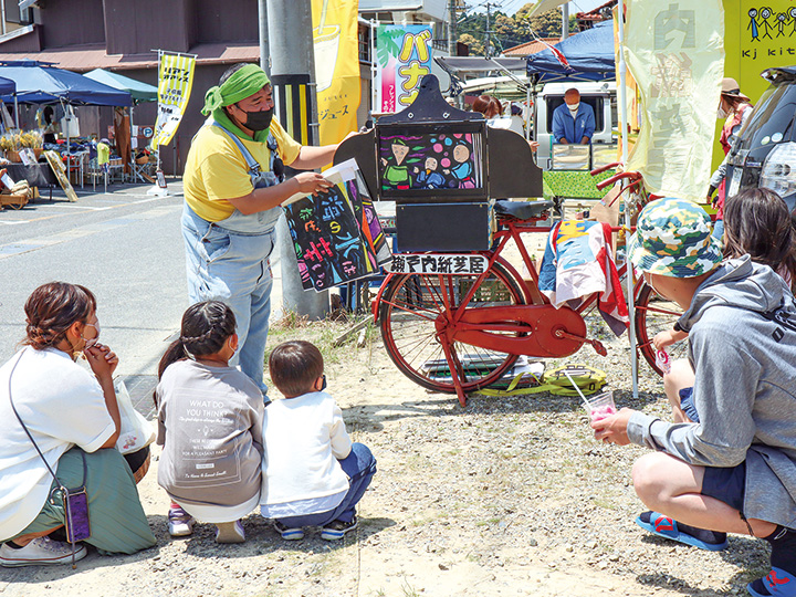 キッチンカーやハンドメイド雑貨、紙芝居、宝すくいなど約50店舗が出店。参加者は、スタンプラリーをしながら各エリアを巡り、安芸津町を満喫していた。特設ステージでは、地元の万葉太鼓演奏やアーティストの音楽演奏などがあった。