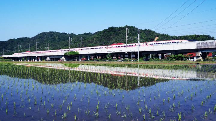東広島市では田園地帯を走るので、田植えの頃には水面に映り、「逆さ富士」ならぬ「逆さ新幹線」が見られます。