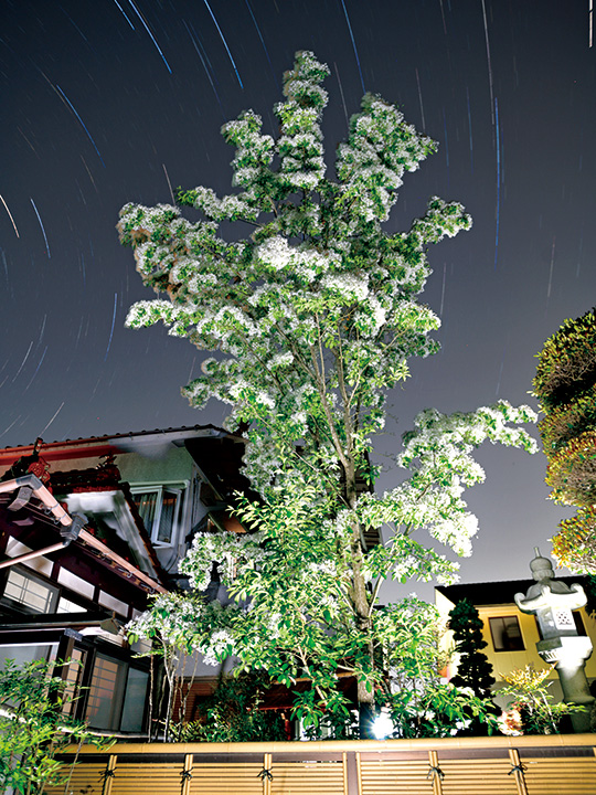 「ナンジャモンジャ」の愛称で知られるヒトツバタゴが東広島市八本松町原の向井省三さん(73)宅の庭で満開を迎え、地域で親しまれています。10年前に苗を購入。今では7㍍余りに育ち、庭でこの1本だけに雪が降り積もったように咲きます。プロペラ型の白い花はハタキのようです。花期は1週間ほど。パッと散ると根元は雪が積もったようになります。ライトアップして長時間露出(70分)で星の軌跡も撮影しました。