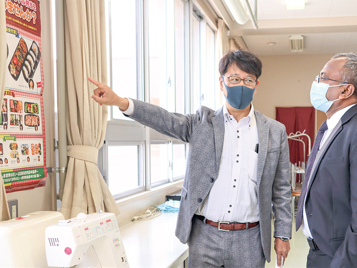 ラシード大臣は、向井校長や広島大学教育開発国際協力研究センターの日下部達哉副センター長らの案内で校内を見学。