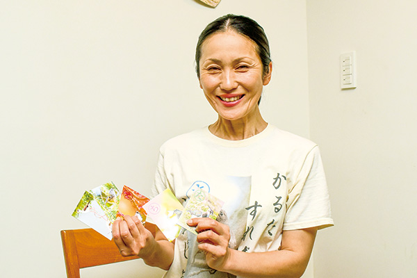 「ひがしひろしまとりかるた」(上)と石田恵さん(撮影・小林)