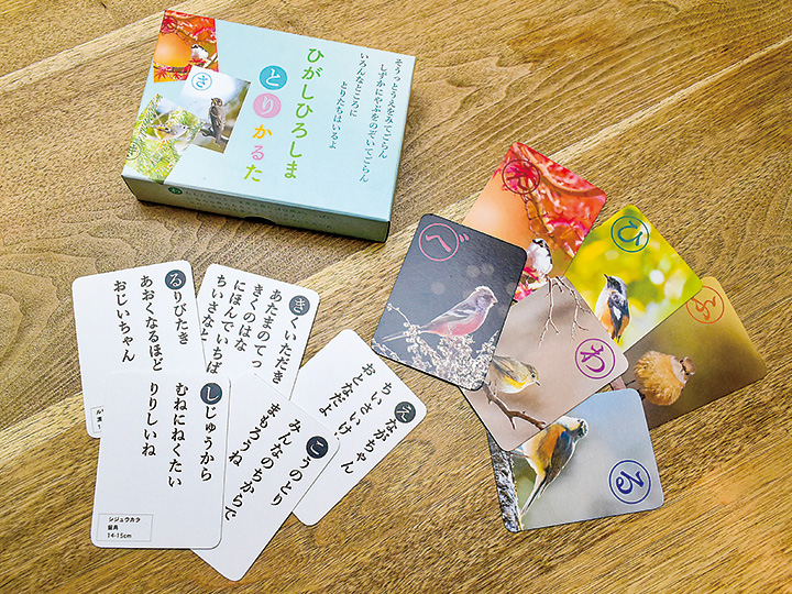 東広島市西条町の石田恵さんが、東広島市内で撮影した鳥の写真を使った「ひがしひろしまとりかるた」を制作・販売している。ワークショップやイベントなどで、子育て世代を中心に人気だ。