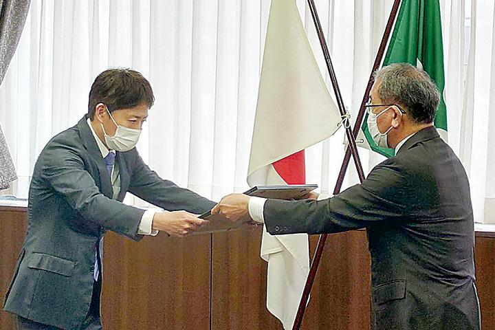 受納式で高垣広徳市長は「これまでも防犯パレードへの参加など、日頃から多大な貢献をいただいている。寄付金は、市が掲げる『市民協働のまちづくり』を推進するための事業に活用したい」と謝辞を述べた。