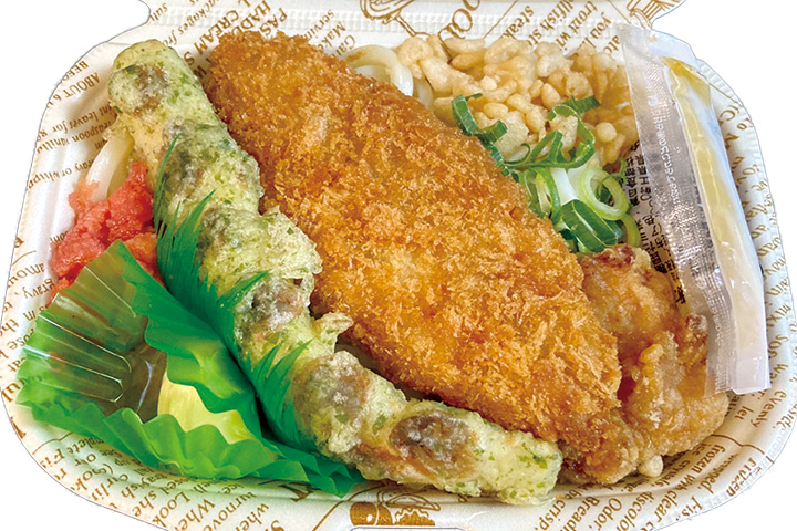 白身フライにちくわ天、これはのり弁の定番おかずではないか。こんなのうどんに乗せちゃう?と言いたくなるようなボリュームあるうどん弁当が登場😋。