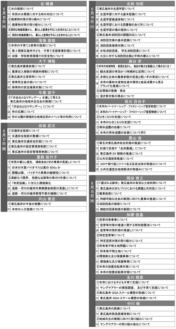 6月14~17日の一般質問の質問者と内容(敬称略)