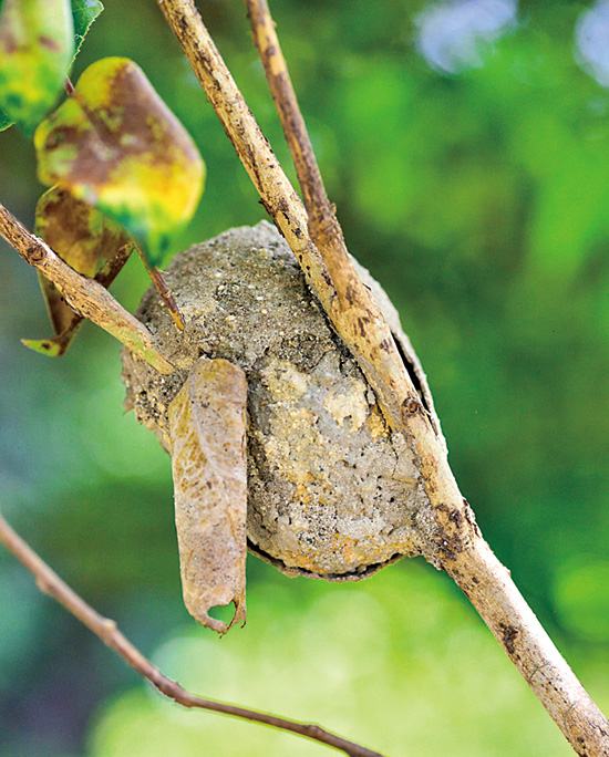 山茶花の枝に泥の塊のような丸い巣を見つけました。
