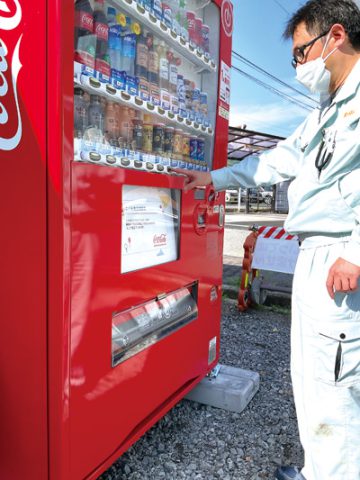 道路工事の現場事務所に設置された自販機。売り上げの一部がこども地域食堂に寄付される。設置したい事業所は東広島市社協に問い合わせを