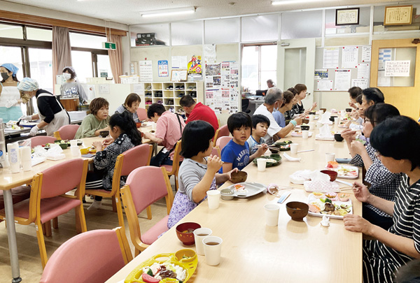 上・下=SATO☆くろせ地域食堂の一コマ。子どもから大人までが集まり昼食をいただく。大学生のボランティアが子どもの学習を見たり、一緒に遊んだりもする。就労サポート「ありんこ」が場所を提供