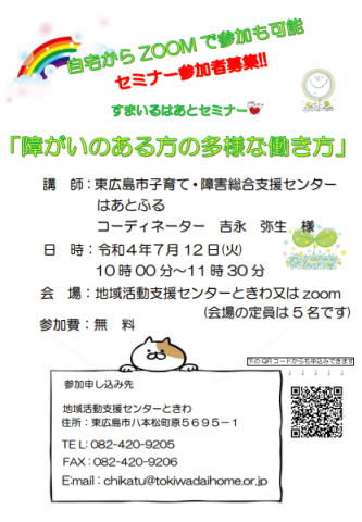 ●場所/地域活動支援センターときわオンラインでも可能(Zoom)(八本松町原)