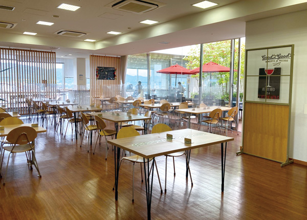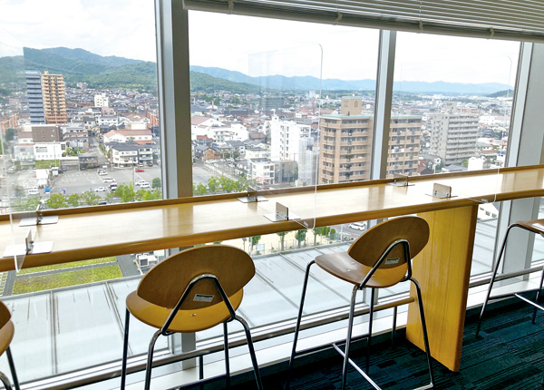 晴れた日は中庭のテラス席もいいな。しかし、窓側のカウンター席がおすすめ。ここからは市役所10階ならではの、いつも見る景色とは違う角度で楽しめる。酒蔵の煙突も道路を走る車も上空から見たらすごく小さい。おいしいものを食べながら、ぼーっと外を眺める…最高な幸せ時間。