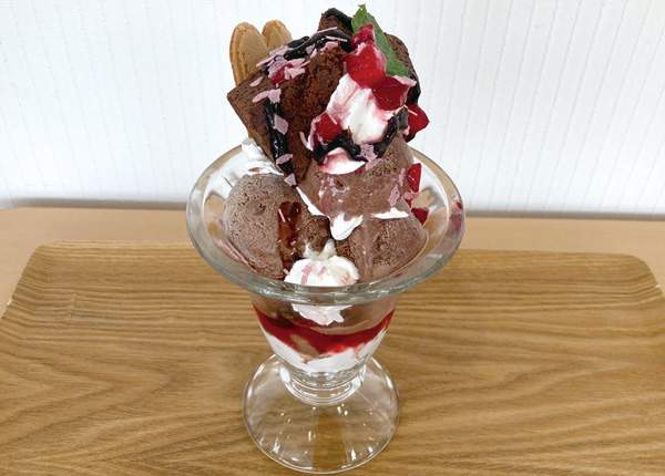 その中から紹介するのが「チョコレートパフェ」。チョコレートアイスとガトーショコラが乗ったパフェ。抹茶フレークやホイップクリームもアクセントになり、ベリーソースとチョコレートとの相性もバッチリ。販売時間は平日の1時間半のみ。ご注意ください。