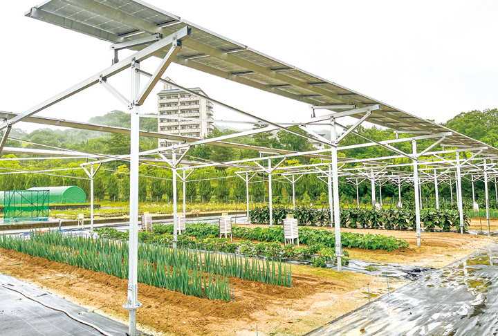 東広島キャンパスのほ場に、高さ約3㍍のソーラーパネルを設置。遮光率30~50%の異なる環境をつくり、さまざまな農作物を栽培し、それぞれの環境で生育調査や品質評価を行っている。