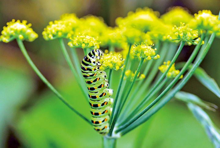 「花を食べる芋虫がいる」と聞き行ってみると、フェンネル(ハーブの一種)にキアゲハの幼虫がいました。女郎花によく似た花を夢中で食べています。