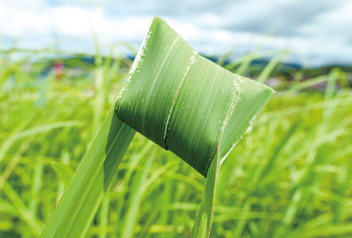 風にそよぐカヤの葉の先にチマキのようなものが付いていました。きちんと折り畳んでいるので、人の仕業かと疑いましたが、図鑑に載っていた写真を思い出しました。