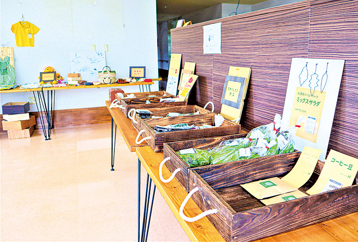 直売所には、同苑の利用者が育てた5種類のベビーリーフやコーヒー豆、ダンボールで作った猫の爪とぎとベッドの他、地域の人が育てた野菜、他の事業所の利用者が作ったパンや雑貨、手芸品などが並んでいる=写真。利用者自らが作った商品を直売所に出品し、地域の人に購入してもらうことで、働くことへの意欲や喜びになっているという。
