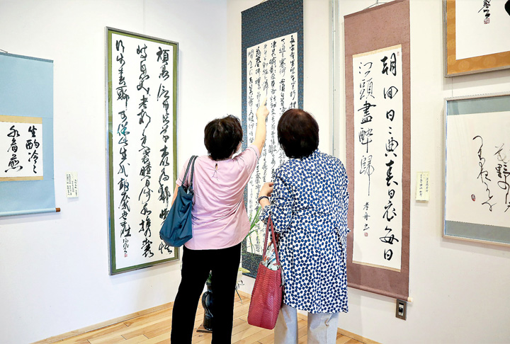 会場には、漢字で書いた作品やかなで書いた作品、羊毛筆で書いた作品、びょうぶの作品など、約50点の奥深い作品を展示。友達と訪れた同市八本松町の60代の女性は「貼り絵などもあり、楽しんで書かれたのがよく伝わり、私たちも楽しんで見ることができた。表装や展示の仕方など勉強になり、自分も書いてみたいという気持ちになった」と笑顔で話していた。