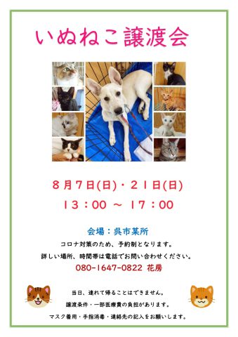 成猫&子猫多数参加予定。コロナ対策のため予約制です。時間帯、場所は直接お電話でお問い合わせください。