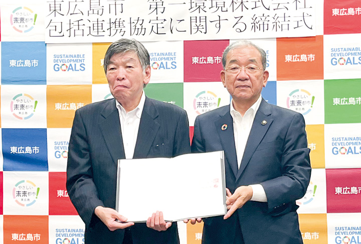 東広島市と水道検針業務を営む第一環境(本社・東京都港区、岡地雄一社長)が7月12日、包括連携に関する協定を締結した。締結式は同市市役所であり、高垣広徳市長と岡地社長がそれぞれ協定書に署名した。