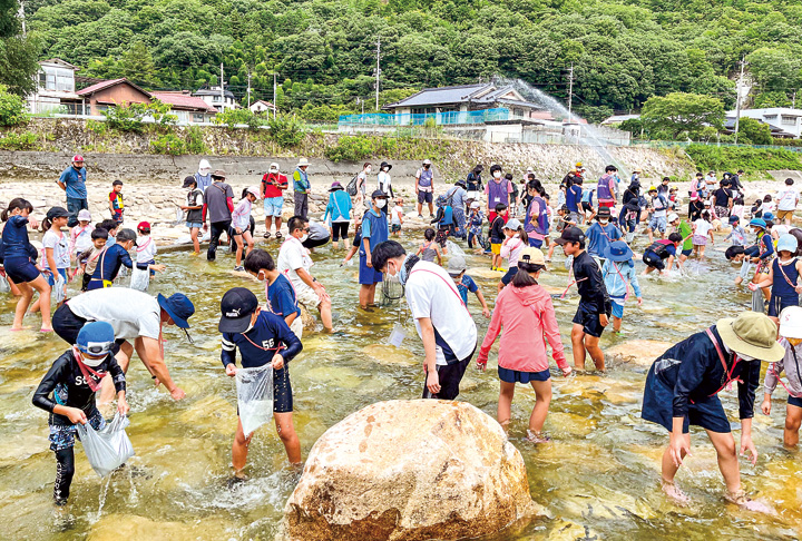 東広島市河内地区自治組織「you愛sunこうち」(横山英樹会長)主催の第33回リバーサイドフェスティバルが7月31日、同市河内町の椋梨川河川敷で行われた。約3000人の家族連れや若者が訪れ、鮎のつかみ取りやライブ演奏などを楽しんだ。郷土料理の鮎飯は午前中で完売した。