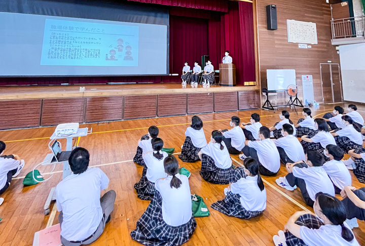 東広島市西条町御薗宇の市立松賀中学校(加藤真悟校長)で、7月15日、職場体験報告会が行われた。体育館に集まった1年生145人を前に、職場体験を行った2年生の6人が職場で学んだことについて報告した。