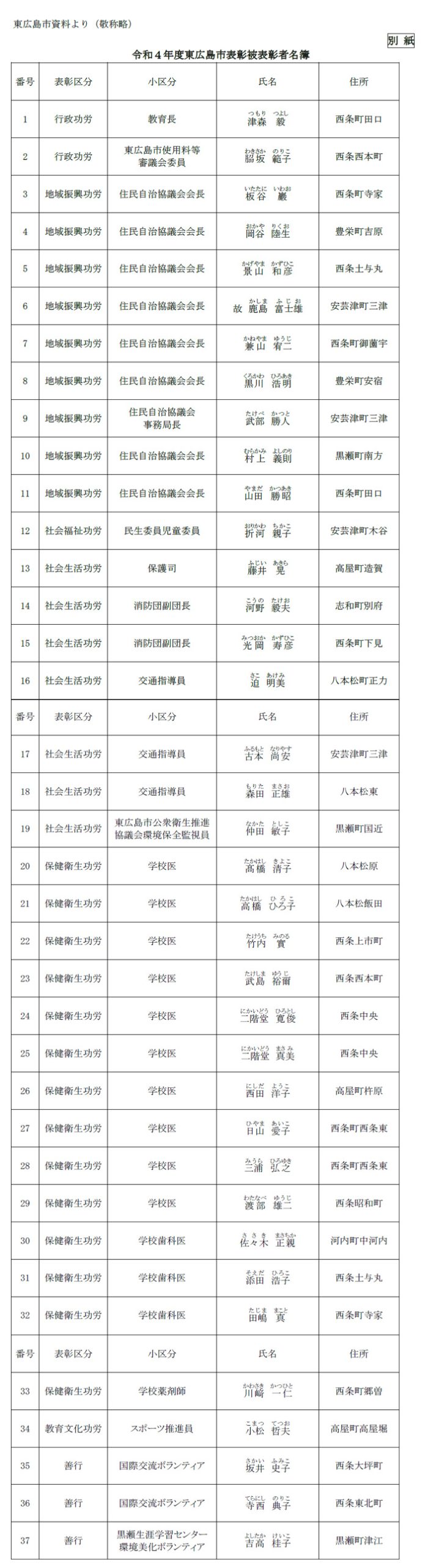 東広島市は、市政の発展に貢献した市民らを表彰する「令和4年度東広島市表彰式」を8月1日、同市西条町御薗宇のグランラセーレ東広島で開いた。