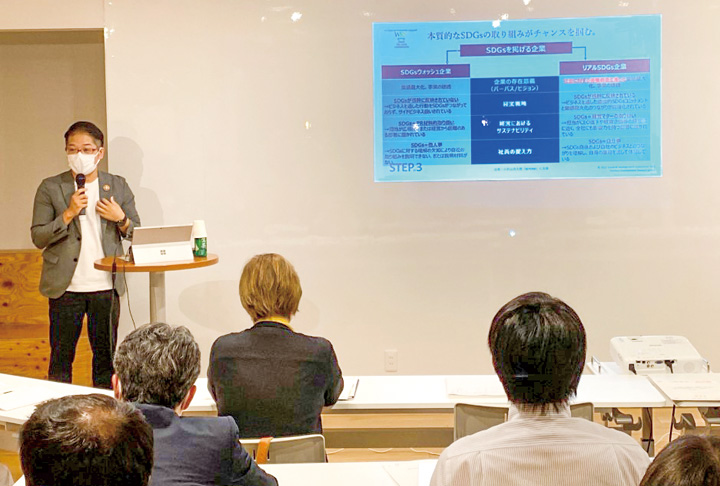講師は、(一社)WES代表理事の信濃晋介さん。信濃さんは「企業にとってSDGsはチャンスか、リスクか」のテーマで講演。SDGsを巡る具体的な取り組み事例などを紹介した。参加者は、「SDGsの取り組みの意義を十分理解できた」、「社内で認識を高める必要性を再認識した」、「他企業の取り組みや課題を共有でき有意義だった」などと話していた。