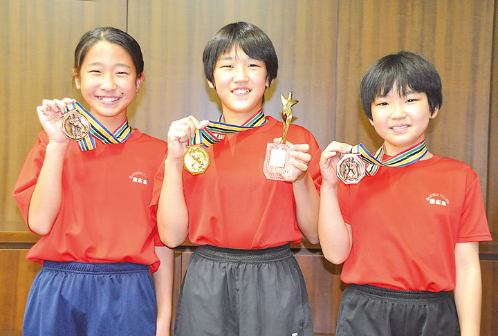 3人は、市立板城小6年の西尾羽珠(うみ)さん(11)と、羽珠さんの妹で同小5年の西尾紗羽(さわ)さん(10)、市立三ツ城小4年の福田和奏(わかな)さん(10)。西尾羽珠さんは女子6年生の40㌔級で見事に優勝、西尾紗羽さんは女子5年生の36㌔級で、福田さんは女子4年生の33㌔級でそれぞれ3位に入賞した。