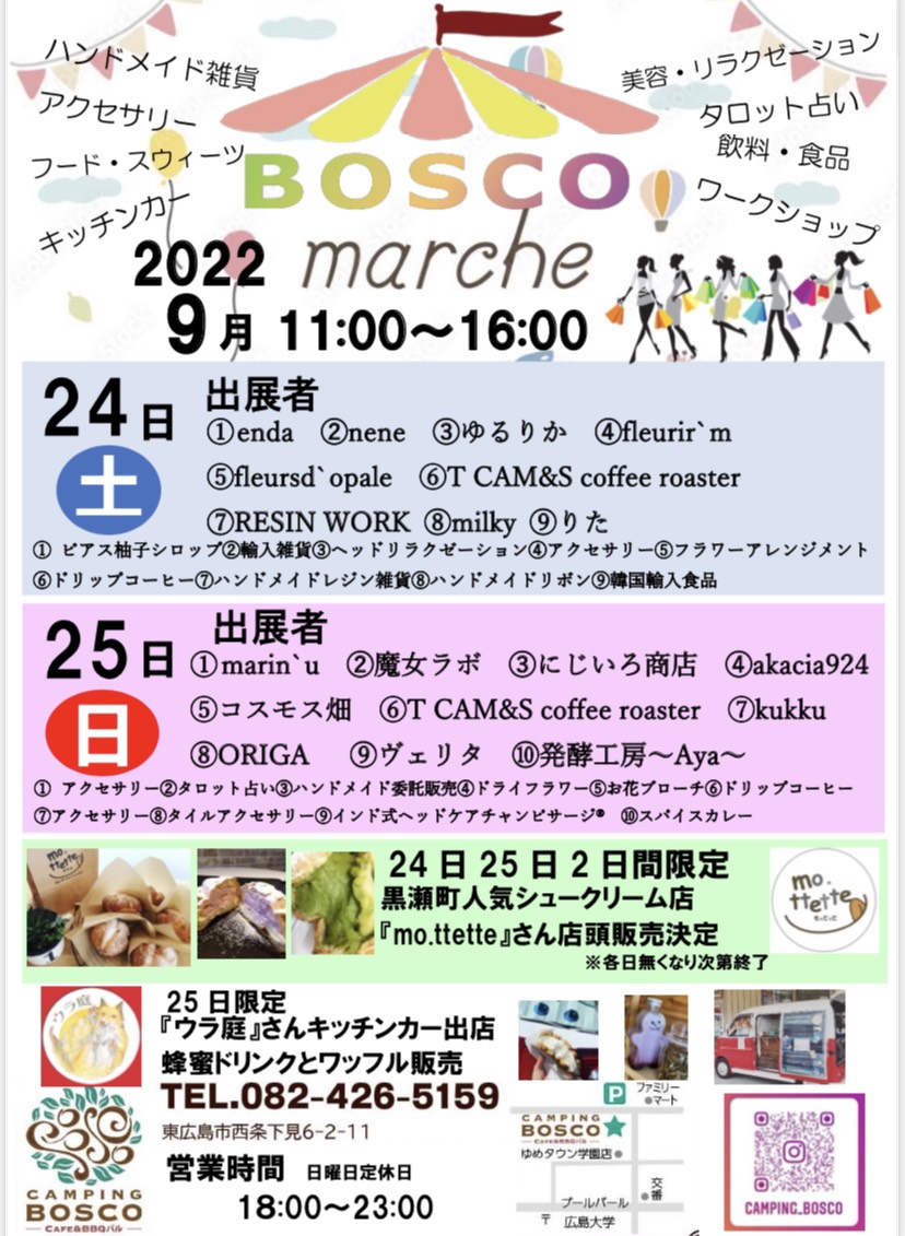 ハンドメイド雑貨や美容、タロット占いやワークショップなど様々な出展者が集まるマルシェを西条下見にあるCAMPING BOSCOで開催します。