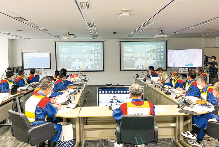 東広島市はこのほど、M6・9、震度6強の直下型地震を想定した総合防災訓練を実施した。関係者約600人が参加。市役所内に高垣広徳市長を本部長とする災害対策本部を設置し、市消防局と、住民自治協議会施設の6拠点をテレビ会議システムでつなぎ、訓練を行った。