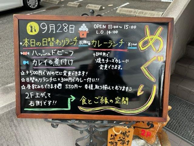 なになに、「西条酒まつりINめぐり」。10月8.9の両日。8日は11:00~18:00、9日は11:00~15:00。数量限定でめぐり特製の「おいなりさん」(税込み200円)、「キンパ(チジミ入り)」(税込み250円)を販売。店内では、おまかせメニューが食べられるようです。楽しみですね。