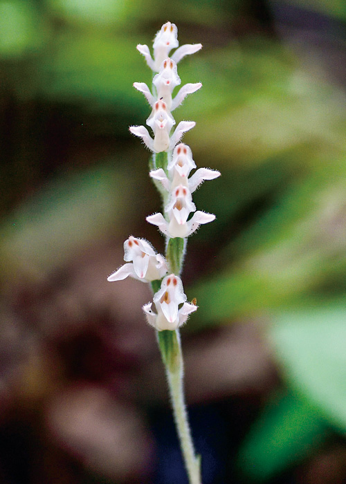 地元の方の案内で、いつもと違う場所で4本のミヤマウズラ(深山鶉)を見つけました。登山道の山ののり面に隠れるように咲いています。