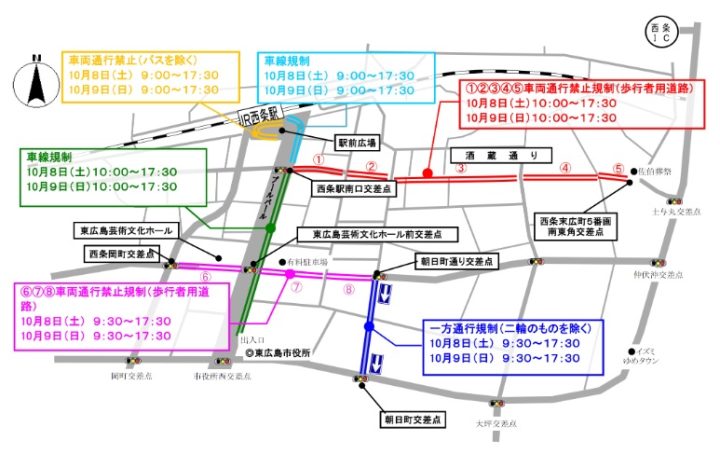 東広島市を代表するまつり「酒まつり」が10月8~9日、JR西条駅周辺で3年ぶりに現地開催されます。2022年は規模を縮小しての開催ですが、会場の一部道路で車両通行禁止や一方通行の交通規制が行われます。まつりに行こうと考えている人、近くを走行する人は注意が必要です。