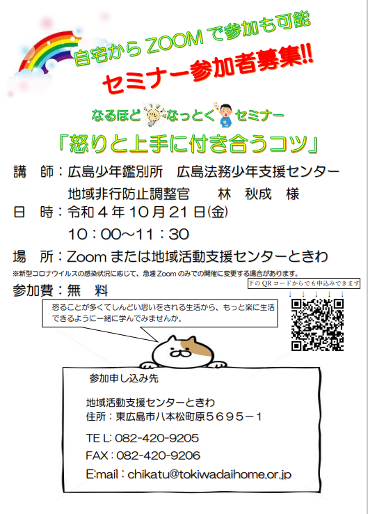 講師に広島少年鑑別所 広島法務少年支援センター 地域非行防止調整官 林秋成(はやし あきなり)様をお迎えし、怒りと上手に付き合うコツについて学びます。参加無料。申し込み締切10月20日(木)。