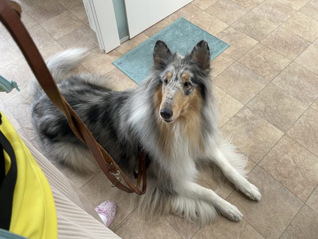 雪恋(セレン)君、リポート中継中は、ずっと上野さんの側にピッタリ寄り添い話を聞いていましたが、「話が長くなりそうだな」と感じとると、リラックス体制に(笑)。それでも時々顔をあげて上野さんを見ていましたよ(かわいぃ)。リポートが終わった後は、私にもピタッとくっついてくれて・・・けど、体が大きいので力強い(笑)。上野さんいわく、「自分(セレンくん)ではトイプードルサイズだと思っているんです」って。癒されました~。